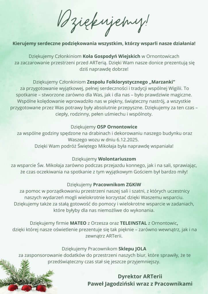 Dziękujemy Sabinie Rymarczyk – Serdecznie dziękujemy za przekazanie kwiatów – gwiazd betlejemskich do przestrzeni ARTerii oraz budynku OSP. Nasze wnętrza zyskały świąteczny, ciepły charakter, a piękne kwiaty wprowadziły wyjątkową atmosferę, która zachęca do odwiedzin i sprawia, że przebywanie w tych przestrzeniach jest jeszcze przyjemniejsze. Dziękujemy za Pani wsparcie, serdeczność i dbałość o to, aby nasze miejsca były przyjazne, estetyczne i pełne świątecznego uroku.