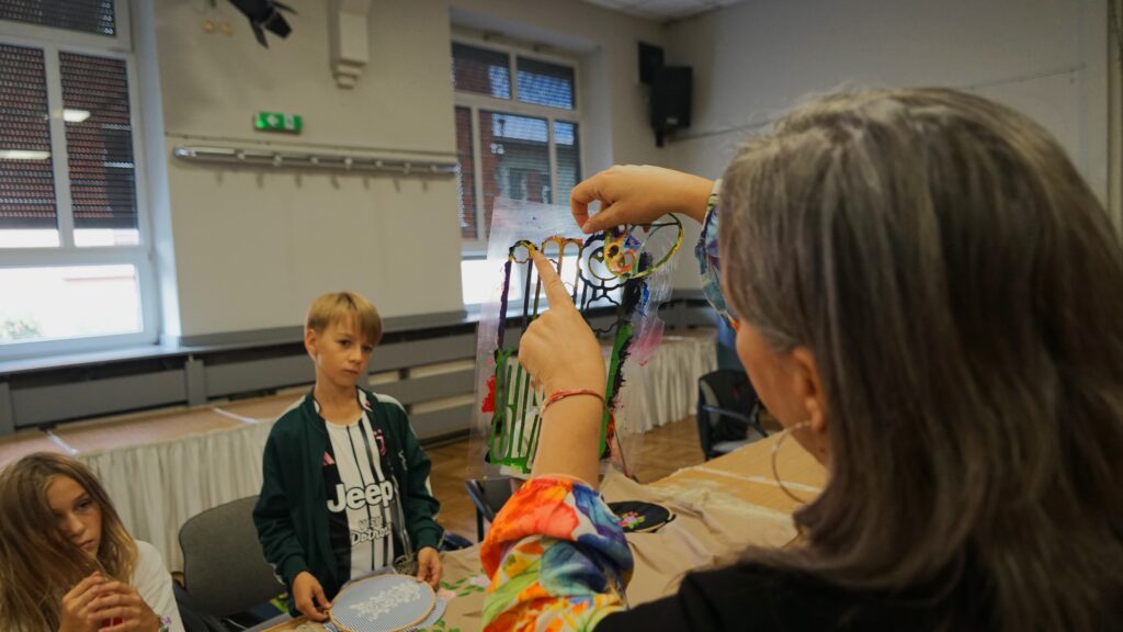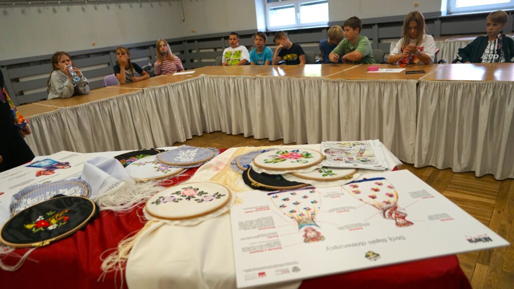 Na początek dzieci wysłuchały krótkiej prelekcji pt. „Etnodesign”, którą poprowadziła dyrektor ARTerii – Aleksandra Malczyk. Okazało się, że tradycyjna sztuka ludowa wcale nie jest „przeszłością”, ale może pięknie łączyć się ze współczesnością. Hafty, wzory i motywy śląskie to inspiracja, którą można wykorzystać w modzie i codziennych przedmiotach! ✨