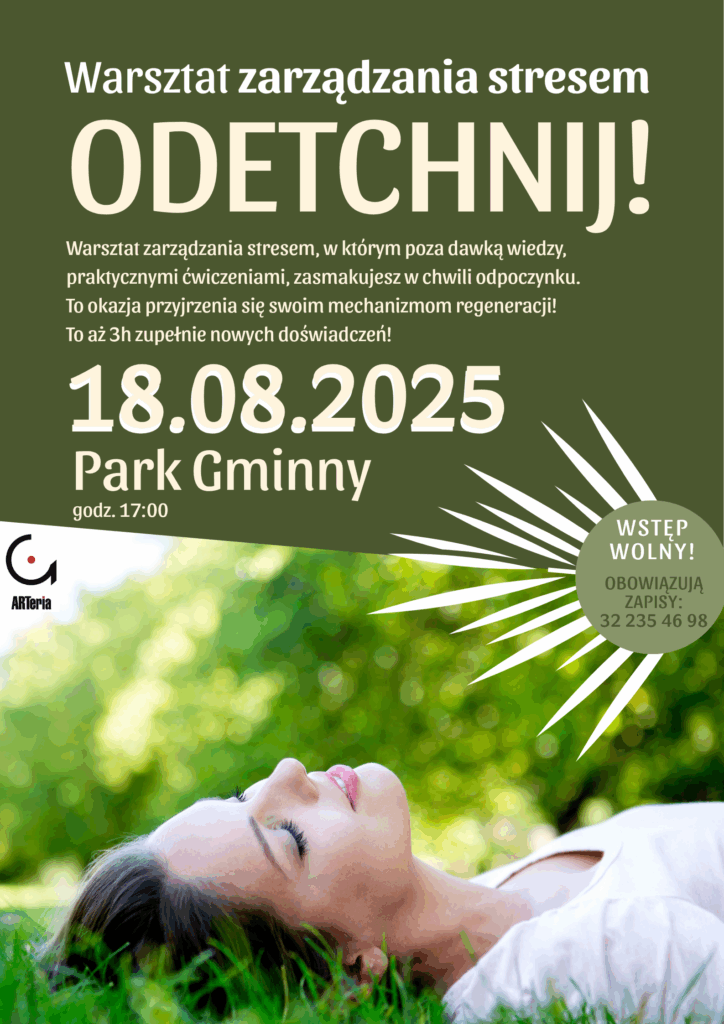 Zapraszamy serdecznie na wyjątkowe warsztaty rozwojowe pod tytułem „Odetchnij!”, które odbędą się 18 sierpnia 2025 roku o godzinie 17:00 w Parku Gminnym w Ornontowicach. Spotkanie potrwa 3 godziny i będzie prowadzone przez Aleksandrę Malczyk, specjalistkę w obszarze psychologii, edukatorkę oraz doświadczoną trenerkę zarządzania stresem.